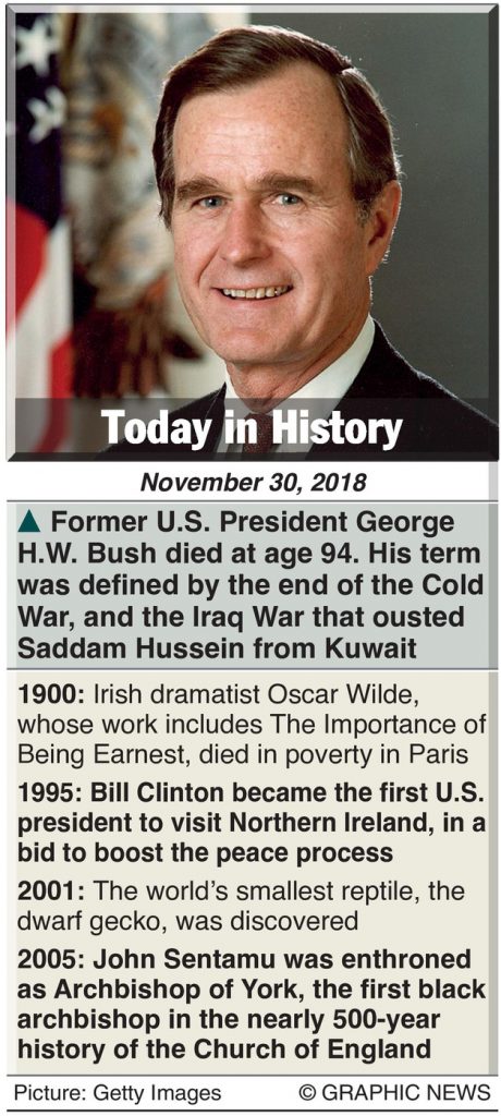 November 30, 2018: Former U.S. President George H.W. Bush died at age 94. His term was defined by the end of the Cold War, and the Iraq War that ousted Saddam Hussein from Kuwait