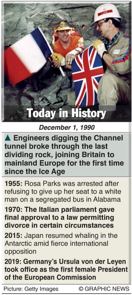 December 1, 1990: Engineers digging the Channel tunnel broke through the last dividing rock, joining Britain to mainland Europe for the first time since the Ice Age