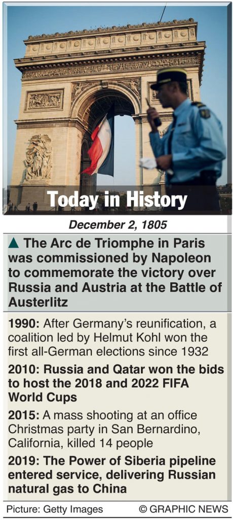 December 2, 1805: The Arc de Triomphe in Paris was commissioned by Napoleon to commemorate the victory over Russia and Austria at the Battle of Austerlitz