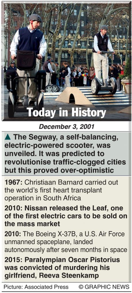 December 3, 2001: The Segway, a self-balancing, electric-powered scooter, was unveiled. It was predicted to revolutionise traffic-clogged cities, but this proved over-optimistic