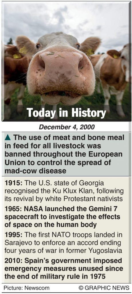 December 4, 2000: The use of meat and bone meal in feed for all livestock was banned throughout the European Union to control the spread of mad-cow disease