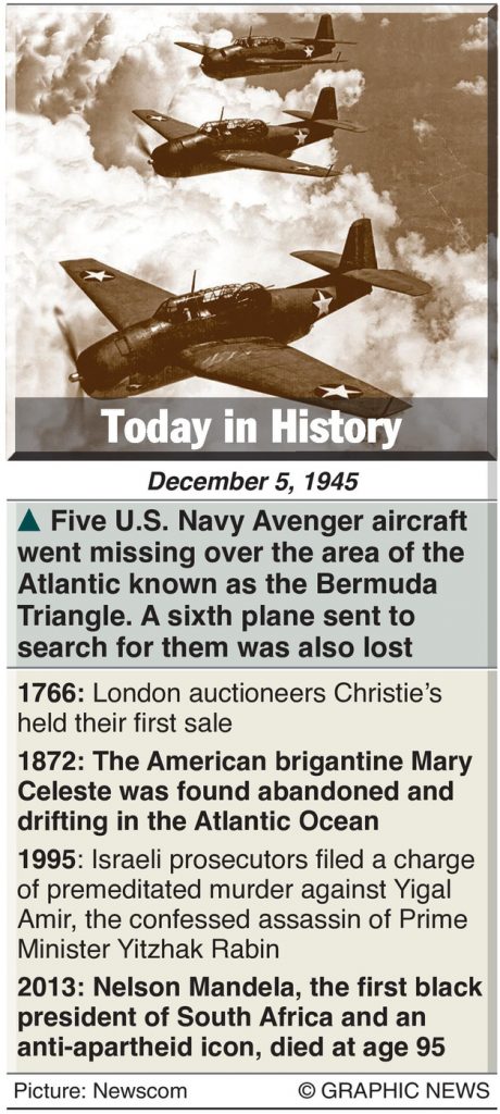 December 5, 1945: Five U.S. Navy Avenger aircraft went missing over the area of the Atlantic known as the Bermuda Triangle. A sixth plane sent to search for them was also lost