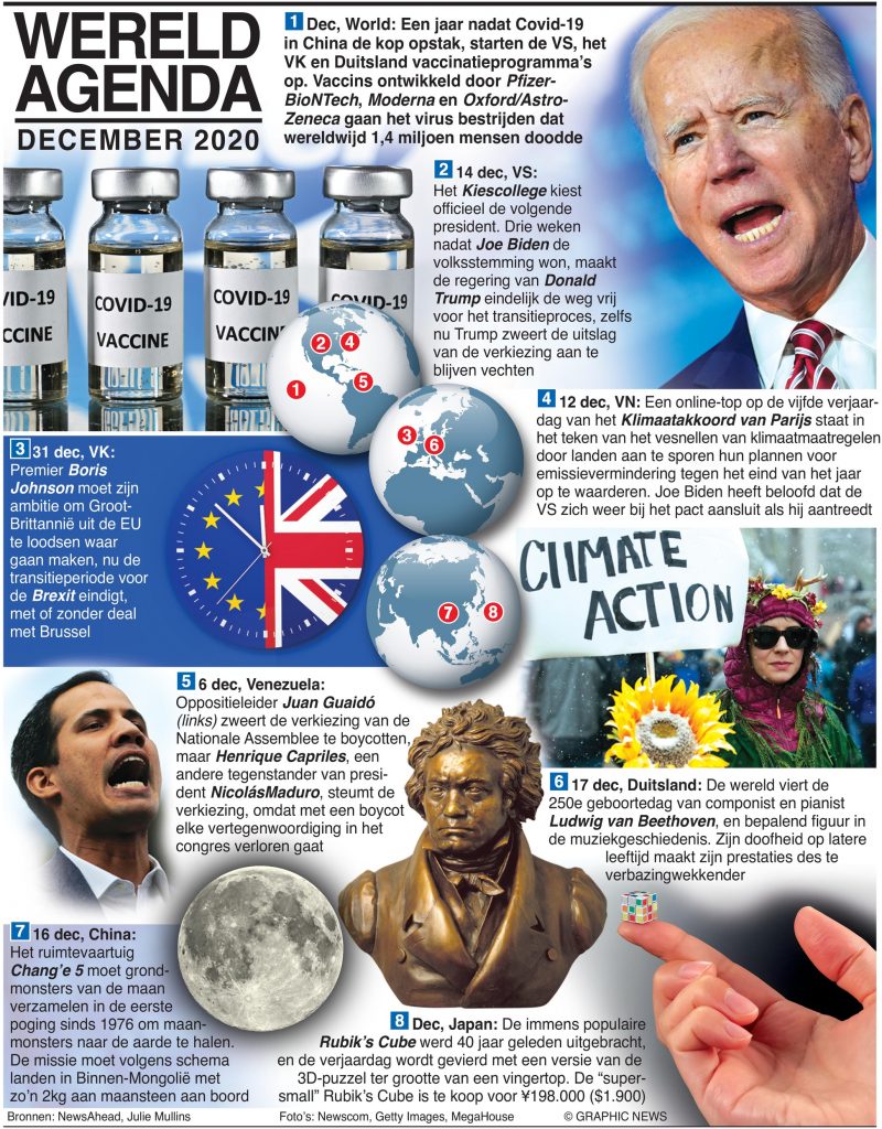 December 1, 2020 – December 31, 2020 – Each month Graphic News publishes a World Agenda of forthcoming events that will shape the world in the month ahead. Events in December include the first vaccination programmes to combat the coronavirus pandemic, the U.S. Electoral College’s confirmation of the election winner (pending ongoing legal action), and the return to China of the first lunar sample return mission since the 1970s.