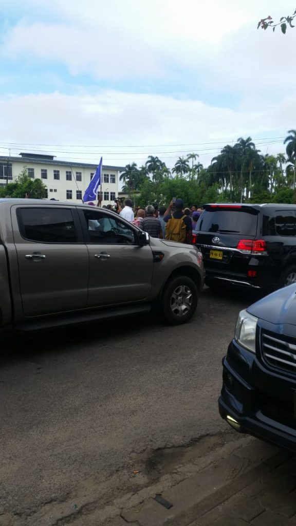 Rond kwart voor negen arriveerde Bouterse bij de Krijgsraad. Zo’n 150 NDP-aanhangers waren aanwezig om hun steun aan de partijleider uit te dragen. Al tegen kwart voor acht stond een groepje sympathisanten op hem te wachten in de omgeving van de Palmentuin.