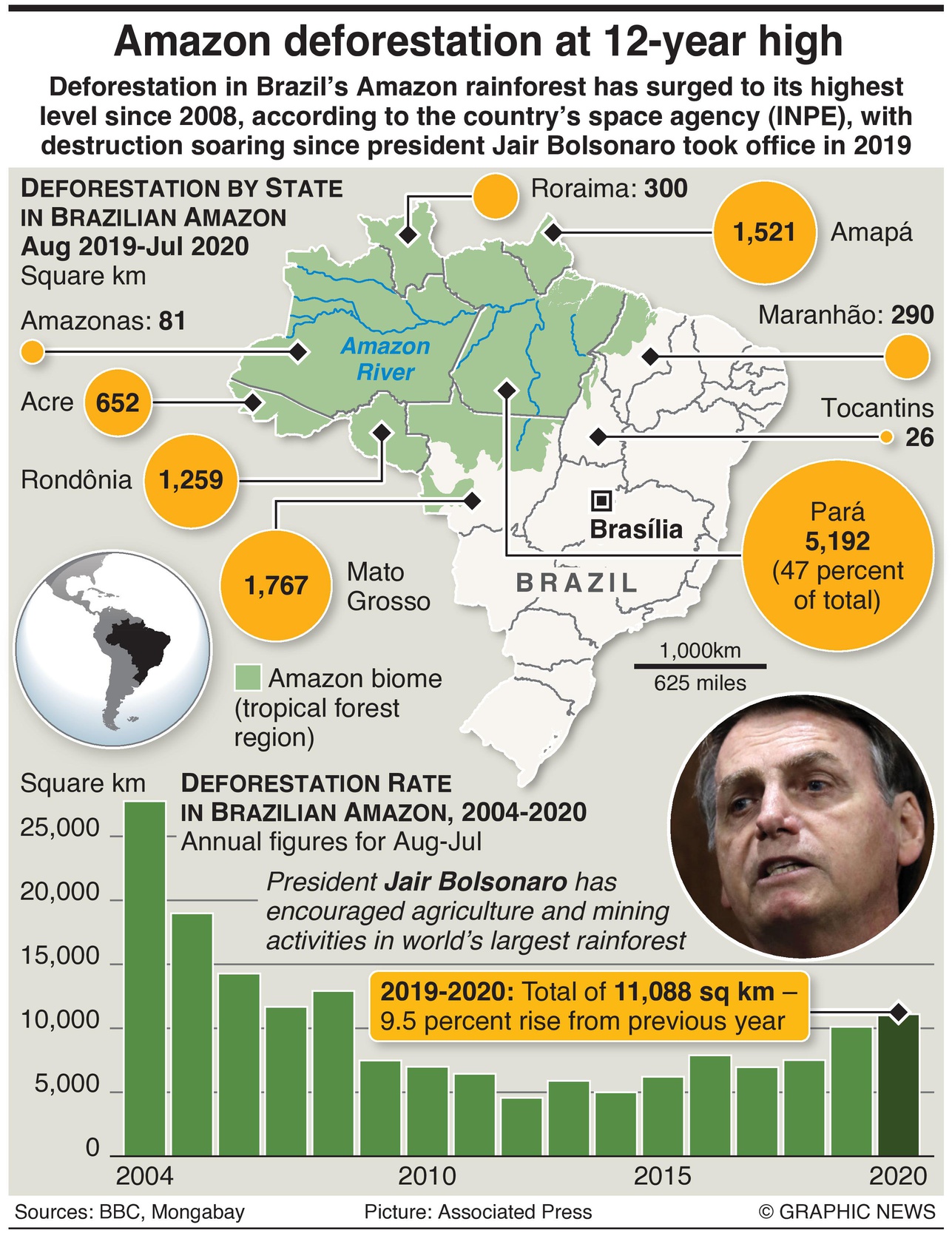 The latest data marked a major increase from the 7,536 square km announced by INPE in 2018 – the year before Mr Bolsonaro took office.