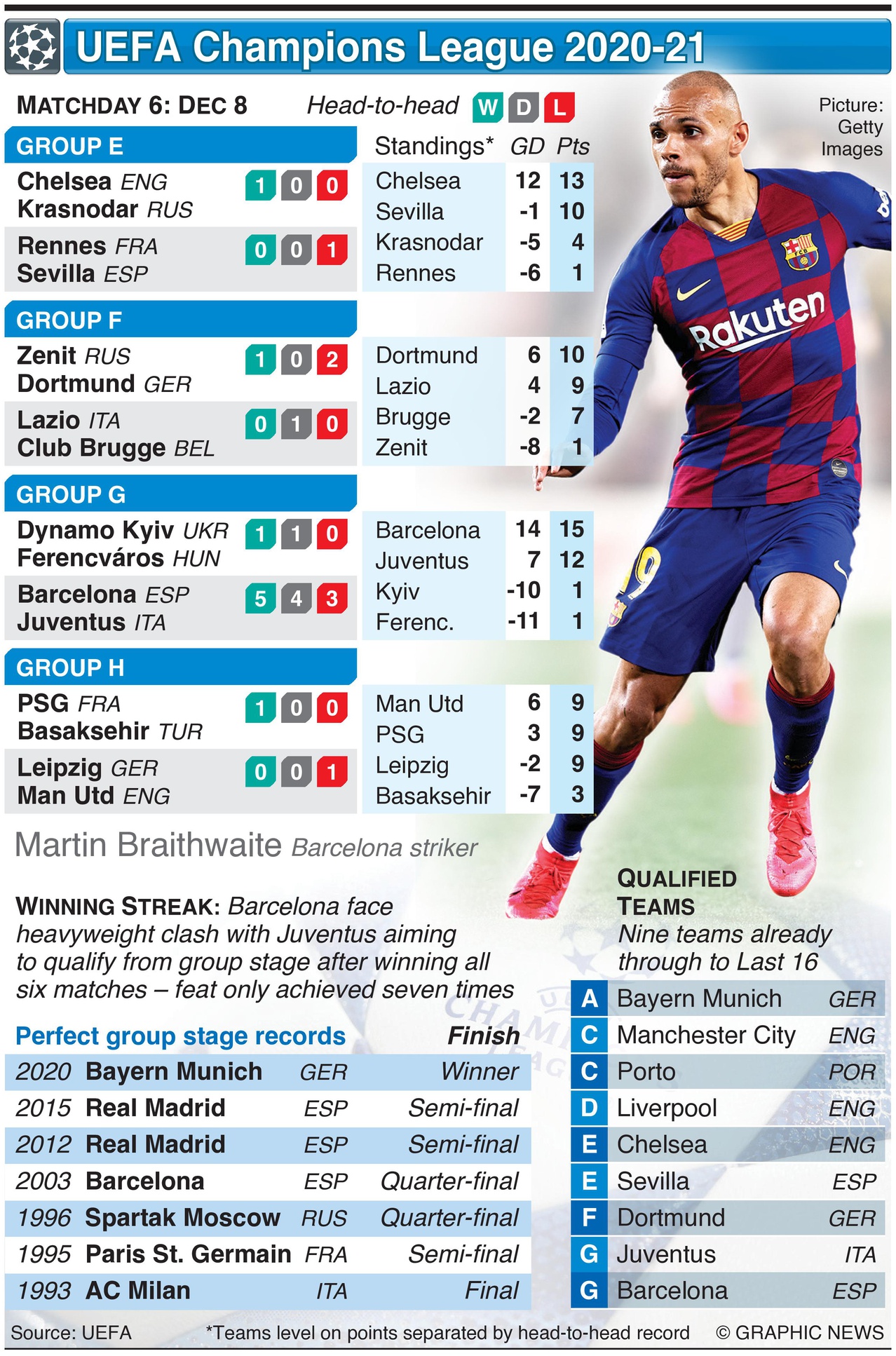 December 8, 2020 – UEFA Champions League Matchday 6, Tuesday fixtures. The group stage Europe’s UEFA Champions League season concludes, with teams aiming to seal one of the remaining seven places in the Last 16. Key fixtures include both contests in Group H as Leipzig host Manchester United, and Paris St-Germain welcome Istanbul Basaksehir. Elsewhere, Barcelona face a heavyweight clash with perennial rivals Juventus, aiming to qualify from group stage after winning all six matches. The draw for the Last 16 in the Champions League takes place in Nyon, Switzerland, on December 14.