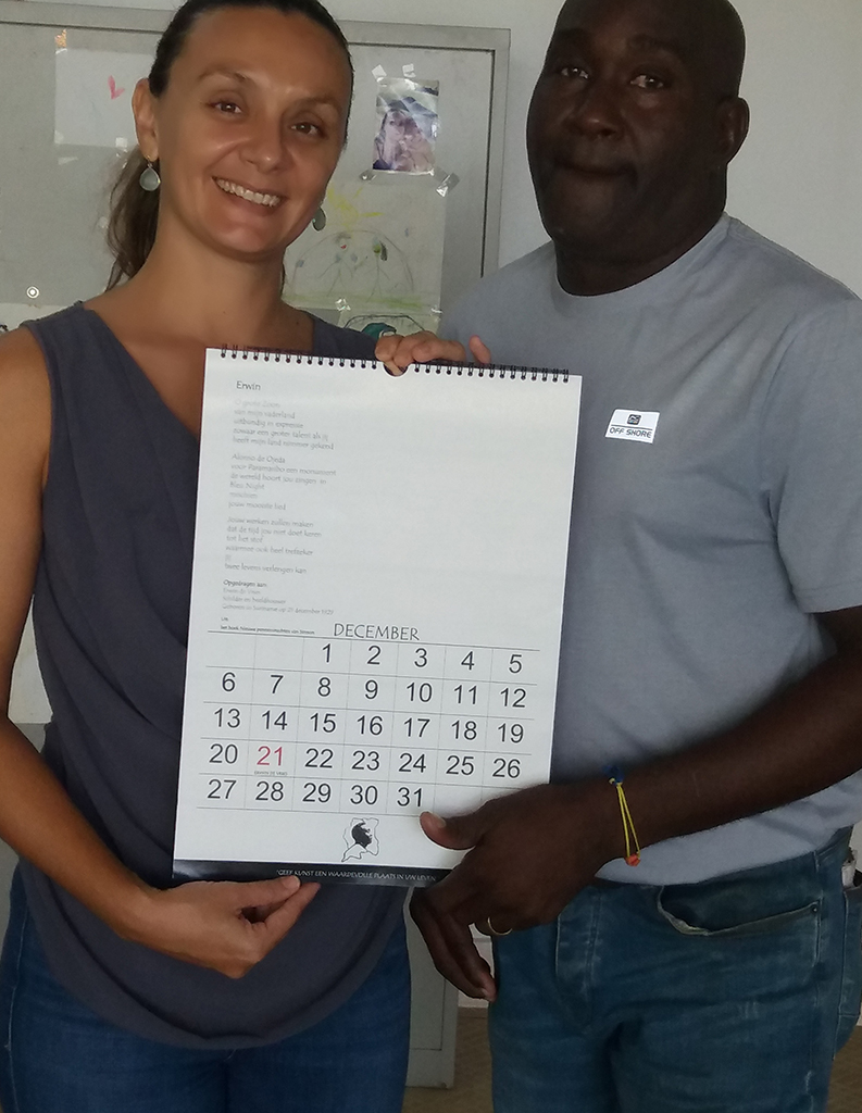 Het december blad van Kalender Waldy Simson 1 is opgedragen aan de schilder en beeldhouwer Erwin de Vries. Dagblad Suriname verkreeg de volgende informatie van de veelzijdige kunstenaar. Met het gedicht getiteld “Erwin”, wordt er een ode gebracht aan de Vries, die ook voor Simson nog steeds een levende en onuitputtelijke bron van inspiratie is. Aan het gedicht heeft de veelzijdige kunstenaar deels in Suriname, Nederland, Aruba en Jamaica gewerkt. Het is ook opgenomen in zijn tweede geschreven boek “Nieuwe pennenvruchten van Simson”, waarin Waldy Simson, onder andere, heeft geschreven over zijn ontmoeting met Nelson Mandela. Dochter van Erwin de Vries en kunstenares Gudrun de Vries heeft namens haar familie van Simson een exemplaar van Kalender Waldy Simson in ontvangst mogen nemen. De kalender is geproduceerd in Suriname, heeft kalenders van maar liefst nog vier jaren, staat in het teken van door Simson gemaakte kunst, is direct te gebruiken en is naast een uniek geschenk ook een perfect middel om sociale projecten te helpen ondersteunen. Uit de opbrengsten van de verkopen van het eerste jaar van Kalender Waldy Simson 1 zal een concreet project ten behoeve van de Nationale Stichting voor Blinden en Slechtzienden in Suriname ondersteund worden.