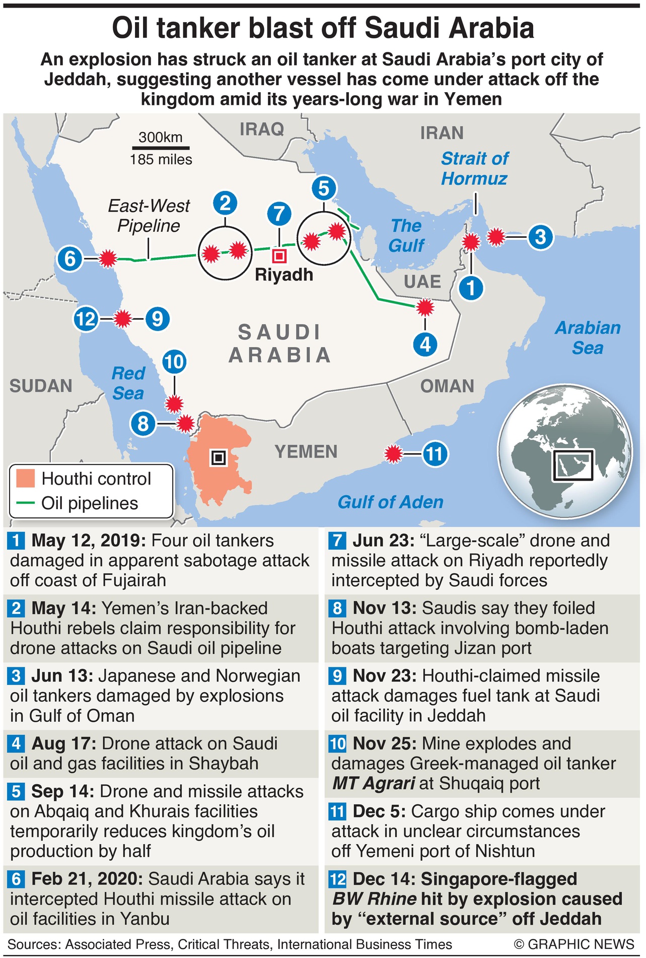 De oliesector in Saudi-Arabië is regelmatig het doelwit van aanvallen. Een maand geleden vond voor de haven van al-Shuqaiq, in het zuiden van het land, nog een ontploffing plaats op een Griekse tanker. De Saudische overheid heeft in het verleden Houthi-rebellen uit buurland Jemen verantwoordelijk gehouden voor aanvallen op tankers en infrastructuur.