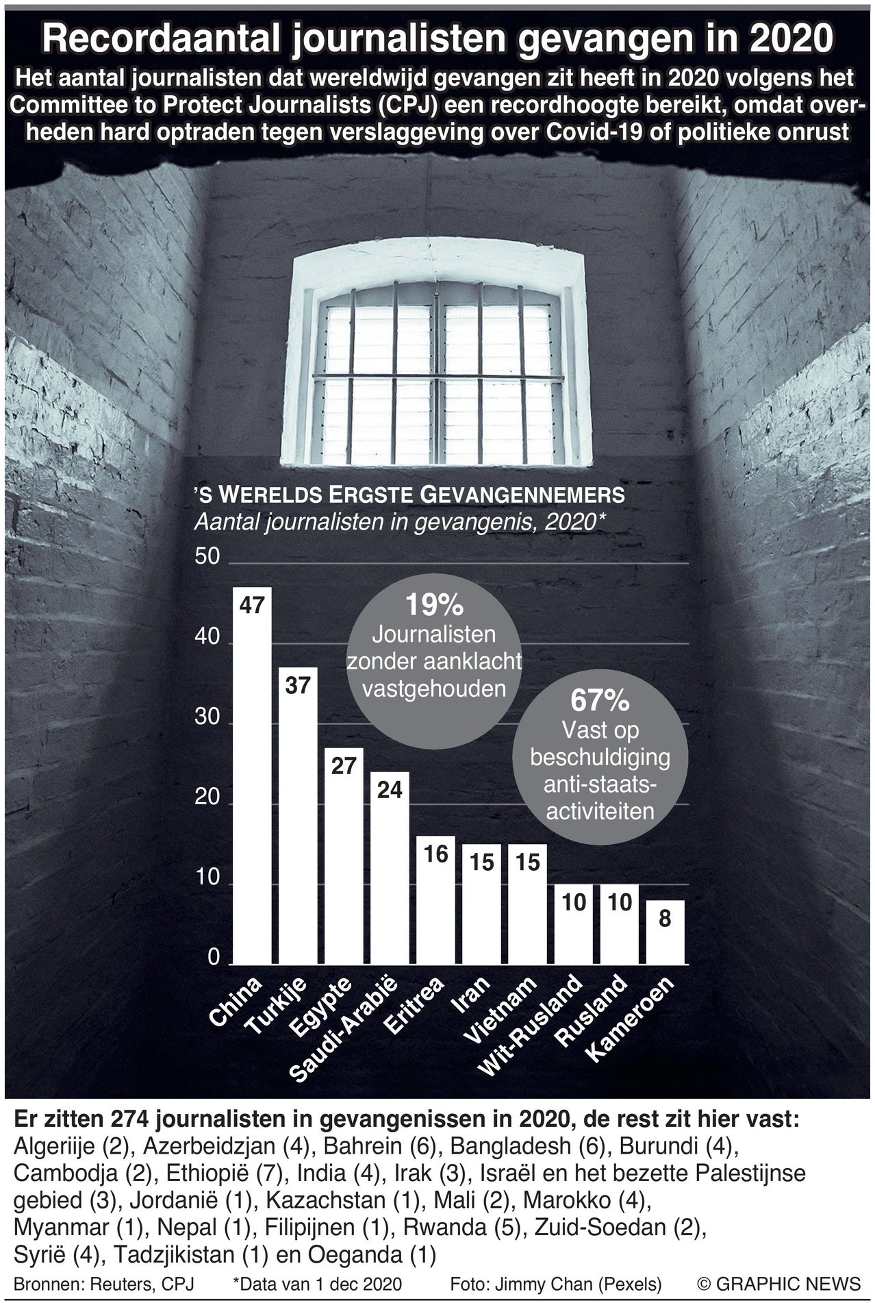 The number of journalists in prison around the world this year has reached a record high of 274 (as of Dec 1, 2020), up from around 250 in 2019.