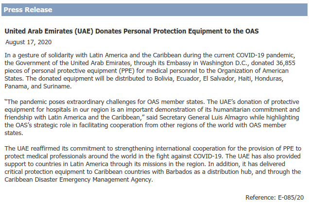 Het land had in het kader van solidariteit en samenwerking in de strijd tegen de indamming van de Covid-19-pandemie al medio augustus een schenking gedaan van totaal 36.855 stuks Personal Protective Equipment (PPE) ten behoeve van de 32-lidlanden van de Organisatie van Amerikaanse Staten (OAS), zo is te lezen op de website van de OAS.