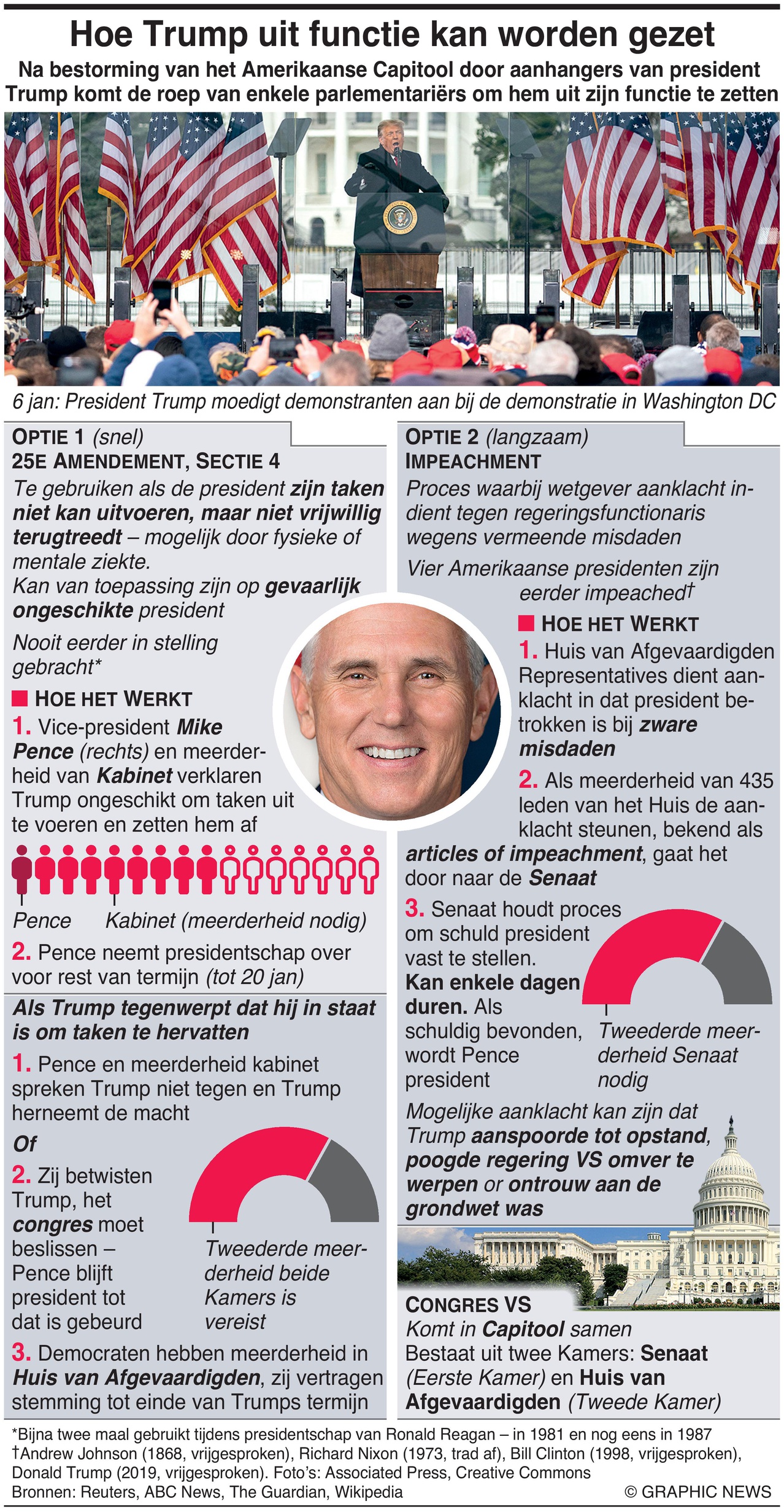 Option 1: According to insiders, there have been preliminary discussions among some Cabinet members and Trump allies about invoking the 25th Amendment, in particular Section 4 which addresses situations where a president is unable to do the job but does not step down voluntarily – possibly incapacitated by a physical or mental illness. Others argue that it could also apply to a president who is dangerously unfit for office.