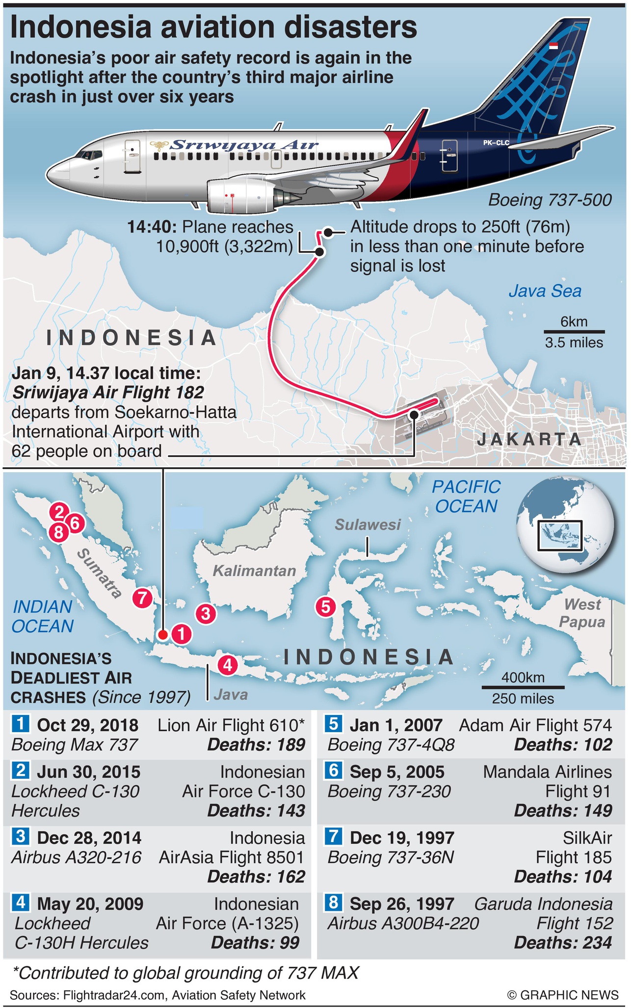 The Sriwijaya Air flight 182 that crashed on Saturday, went missing about 20km north of the capital Jakarta, not far from where another flight crashed in October 2018.