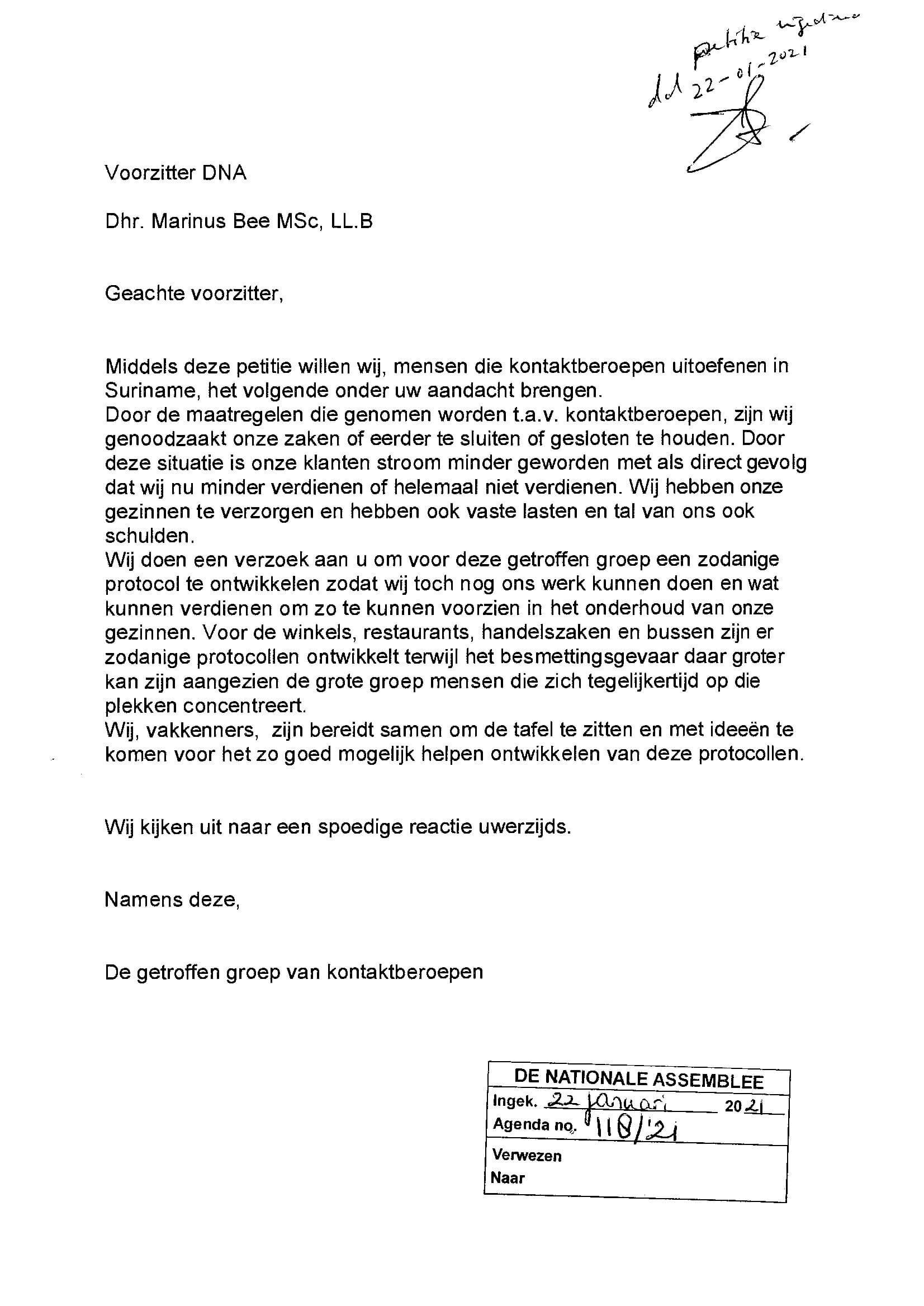 āIk voel mee met jullie. Het is zwaar.ā Dat zei de voorzitter van De Nationale Assemblee (DNA), Marinus Bee, vrijdag bij het in ontvangst nemen van een petitie van een afvaardiging van de contactberoepen, waaronder de kapperszaken.