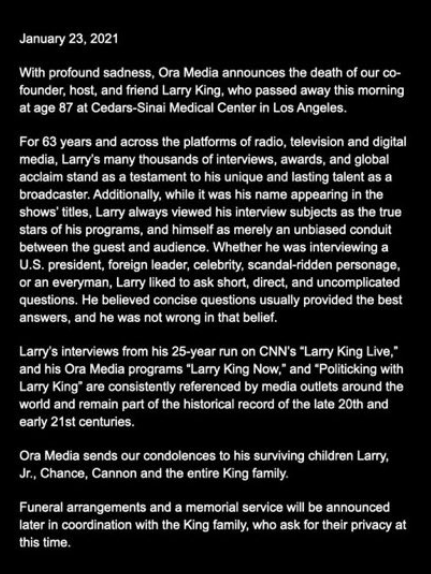 De wereldbekende Amerikaanse talkshowhost Larry King is zaterdag op 87-jarige leeftijd in Los Angeles overleden aan de gevolgen van Covid-19. Dat meldt Ora Media, het bedrijf waarvan de Amerikaanse presentator mede-oprichter is, op haar Ora TV Twitter-account.
