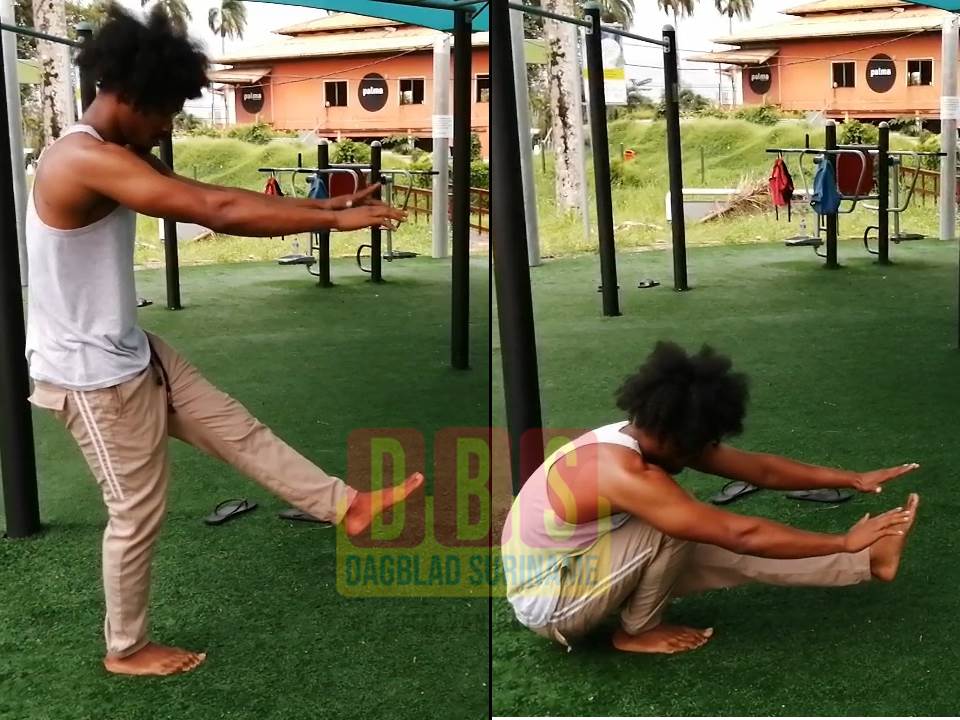 Calisthenics of Callisthenics is een vorm van krachttraining, die in Suriname nog niet bij iedereen bekend is. Verschillende spiergroepen worden getraind, en het vraagt om grote intensiteit om het lichaam in balans te houden. Deze oefeningen worden vaak met minimale apparatuur uitgevoerd, waarbij het eigen lichaamsgewicht in de meeste gevallen centraal staat. De redactie van Dagblad Suriname stuitte op 2 beoefenaren van Callisthenics, die een voorbeeld gaven van de ‘pistol squad’. Bij deze oefening, die een ‘basisoefening’ is voor Callisthenics, sta je op een been, terwijl je de andere 90 graden uitgestrekt houdt, waardoor je lichaam in de pistoolhouding komt. In deze positie zak je helemaal door je knieën, zonder dat je uitgestrekt been de grond raakt. Hierna kom je weer naar boven via een ‘squat beweging’ op een been.