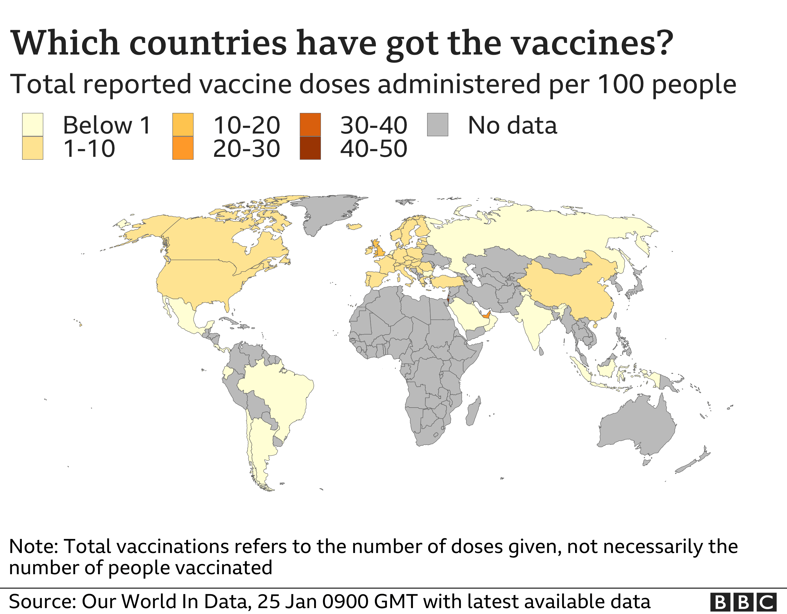 Het hoofd van de WHO, Tedros Adhanom Ghebreyesus, benadrukte deze week de huidige ongelijkheden en zei dat er meer dan 39 miljoen doses zijn toegediend in ten minste 49 landen met een hoger inkomen, maar slechts 25 in één van de landen met de laagste inkomens. In februari moet gestart worden met het verspreiden van vaccins in arme landen en landen met een gemiddeld inkomen. Covax hoopt dat tegen het einde van 2021 meer dan twee miljard doses aan landen over de hele wereld zullen zijn geleverd. Daarvan zal ongeveer 1,8 miljard worden geleverd aan de 92 armere landen die bij de regeling betrokken zijn, waarmee ongeveer 20% van hun bevolking wordt gedekt.