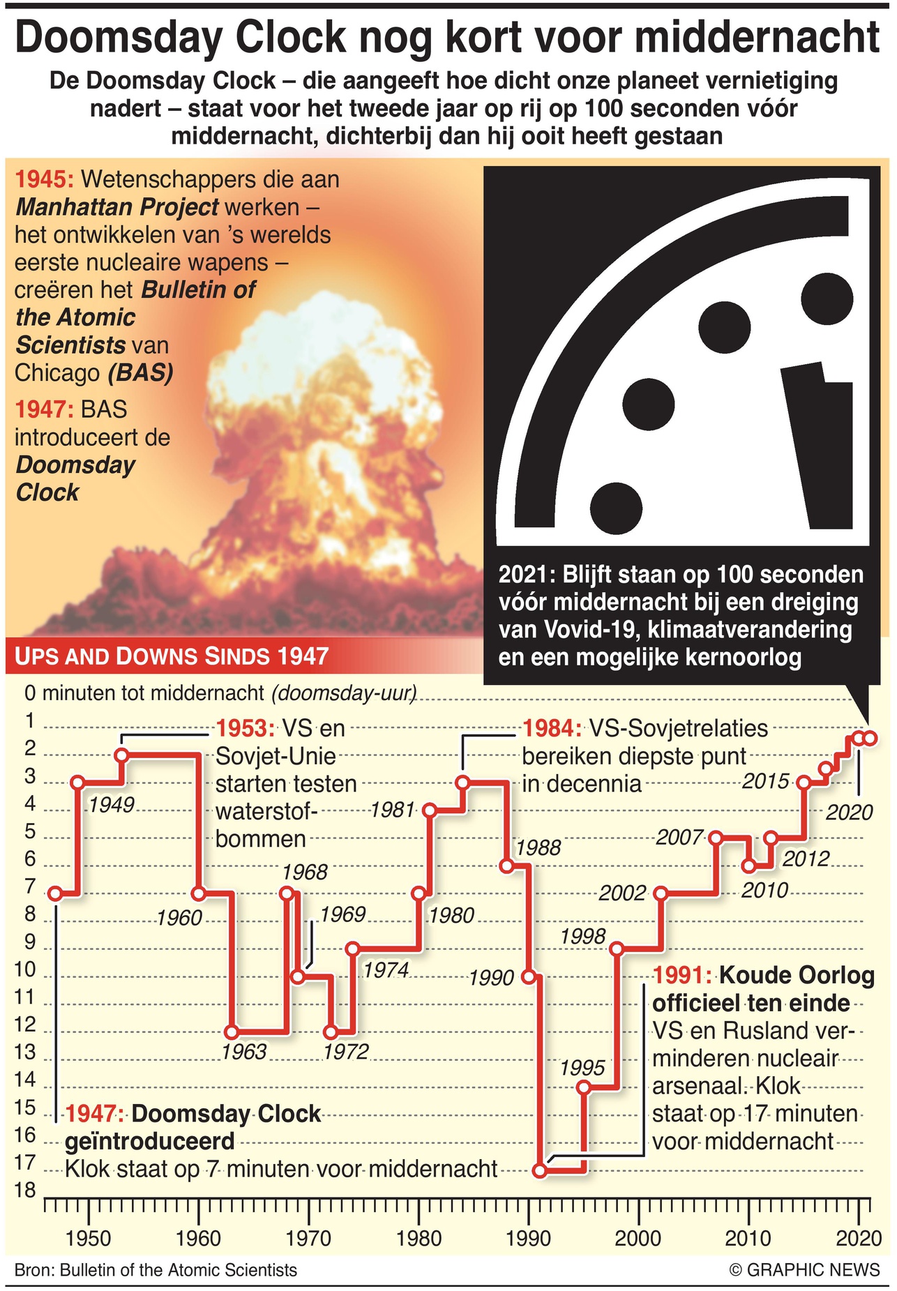 January 28, 2021 – The Doomsday Clock – which indicates how near our planet is to annihilation – stands at 100 minutes to midnight for the second year running, the closest it has ever been