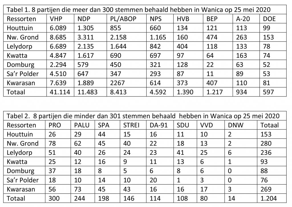 De goed uitgebrachte stemmen in Wanica op 25 mei 2020 bedroeg 70.444 stemmen. De kiesdeler in Wanica was ( 70.444 : 7) x 1 stem=10.063 stemmen. Vanwege het kiesstelsel kan je met minder dan 10.063 stemmen een zetel behalen. Aan de hand van de resultaten van de verkiezingen in Wanica hebben kleine politieke partijen nauwelijks kans om een zetel te behalen. In tabel 2 zien wij dat 8 politieke partijen samen 1.204 stemmen behaald hebben .Willen deze acht politieke partijen gezamenlijk een zetel behalen in Wanica, dan moeten zij in 2025 met ongeveer 700 tot 800% groeien, wat in politiek Suriname bijna onmogelijk is.