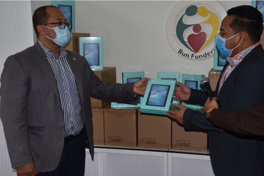 First lady Melissa Santokhi-Seenacherry heeft woensdag als bijdrage aan het onderwijs op afstand, 200 tablets gedoneerd aan het ministerie van Onderwijs, Wetenschap en Cultuur (Minowc). De overhandiging van de tablets werd echter gedaan door haar assistent Gene Sampono aan Yuro Dipotaroeno, directeur Algemeen Vormend Onderwijs.
