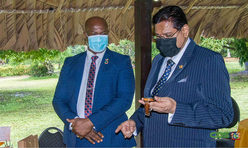 President Santokhi ontvangt houten kunstwerk van kunstenaar Pinas