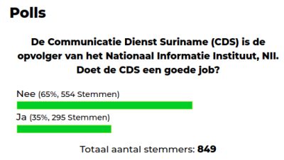 Uit een poll op de website van Dagblad Suriname blijkt dat 65 procent van de mensen die hebben gereageerd (554), van mening is dat de CDS – de opvolger van het Nationaal Informatie Instituut (NII) – geen goede job doet. Maar er is toch nog zo’n 39 procent, dat juist vindt dat de CDS haar werk goed doet (295 stemmen).
