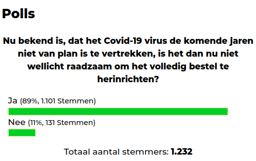 Maar liefst 89 procent van de mensen die hebben gereageerd (1.101), is van oordeel dat het bestel inderdaad zou moeten worden heringericht. Slechts 11 procent (131 stemmen) lijkt een herinrichting van het bestel vanwege de het blijvende covid-virus niet nodig te vinden.