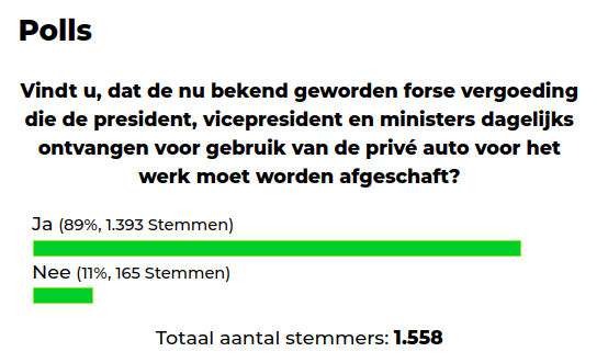 Uit een poll op de website van Dagblad Suriname blijkt, dat zeer veel burgers een forse dagelijkse vergoeding voor gebruik van de privéauto van de president, vicepresident en ministers voor het werk, afwijzen. Inmiddels is overigens de vergoeding vooralsnog van tafel. 89 procent van de uitgebrachte stemmen (1.393) vindt een dergelijke vergoeding niet nodig. Slechts 165 mensen (11 procent) blijkt geen probleem te hebben met de dagelijkse vergoeding.
