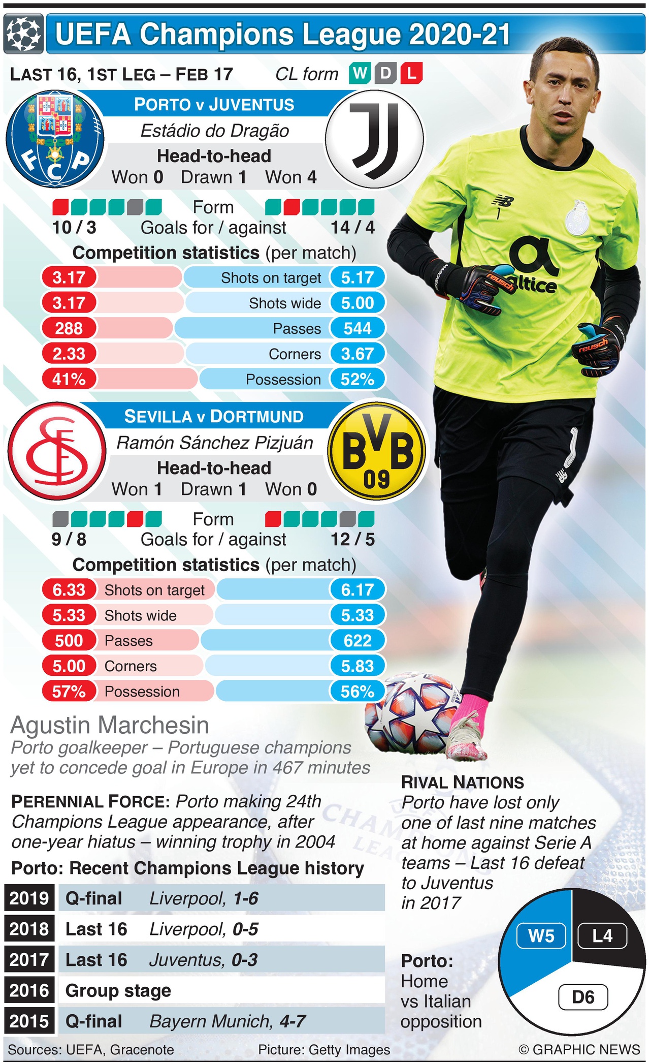 February 17, 2021 – Champions League Round of 16 first leg matches, including match-ups between Porto and Juventus at the Estadio do Dragao, and Sevilla against Borussia Dortmund at the Estadio Ramon Sanchez-Pizjuan. The second leg for these matches takes place on March 9.