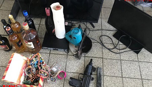 In de woning werd een aantal goederen, waarvan de vijf mannen de herkomst niet kunnen verklaren, aangetroffen en in beslag genomen. Het gaat om een gasbuks in de vorm van een Uzi met houder, twee televisietoestellen, een DVD-player, alcoholische dranken, twee kartonnen doosjes met dames bijouterieën, een cirkelzaag, een zwarte schoudertas en een grijze mobiele telefoon. Na afstemming met het Openbaar Ministerie zijn de vijf verdachten in verzekering gesteld. Aan de aanhouding van M.S. wordt gewerkt.
