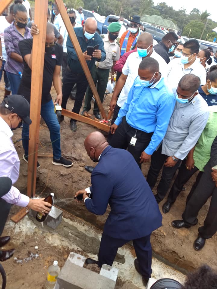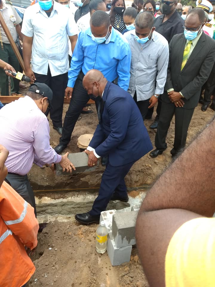 President Chandrikapersad Santokhi en vicepresident Ronnie Brunswijk hebben zaterdag de eerste steen gelegd voor de bouw van een middelbare school te Moengotapoe in het district Marowijne.