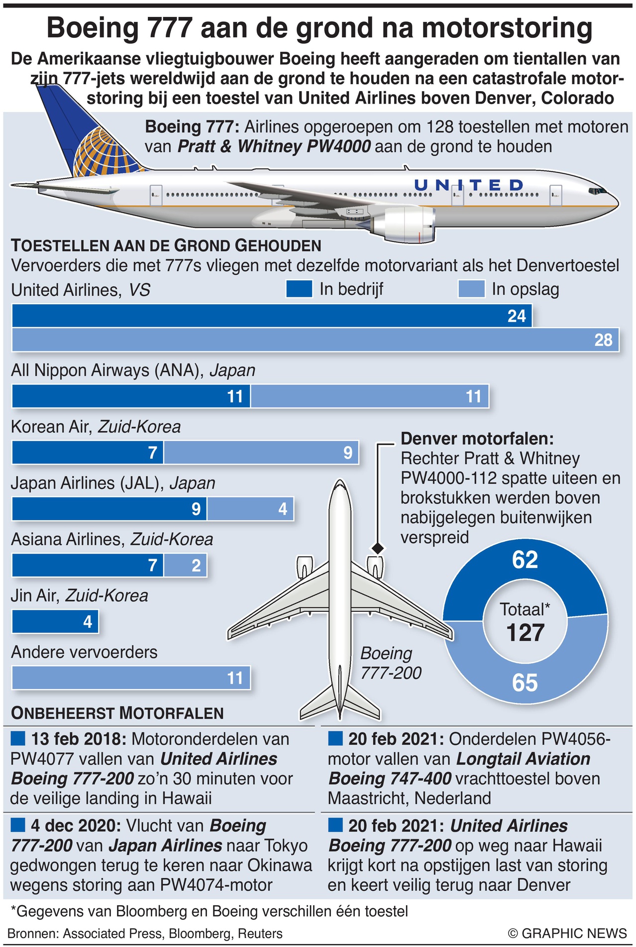 De Amerikaanse luchtvaartdienst FAA heeft opgeroepen om alle Boeing 777’s die met dezelfde motoren zijn uitgerust als die van United Airlines aan de grond te houden. Dit weekend ontplofte één van de motoren van een United-toestel dat op weg was van Denver naar Honolulu.