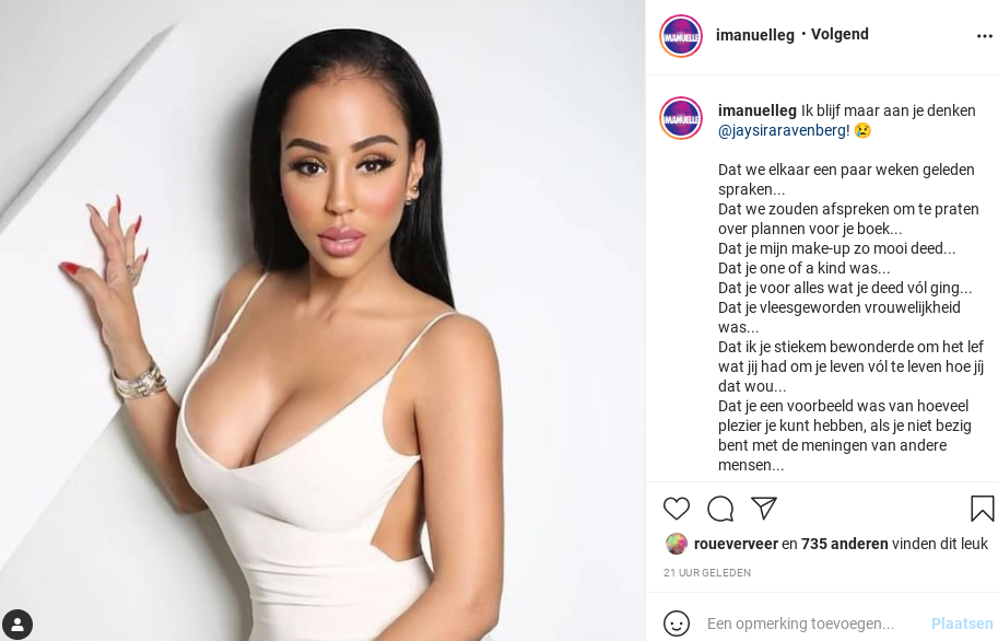 Jaysira Ravenberg was naast make-upartieste ook rapper, (mode)influencer en voorvechtster voor vrouwenrechten. âJe laat héél véél mensen verdrietig achter, die enorm naar je opkeken, van je hielden en van je bijzondere levenslessen wilden lerenâ, schrijft actrice Imanuelle Grives in een bericht op Instagram. De actrice schakelde Ravenberg in voor haar make-up. Ze was volgens haar een uitzonderlijk talent en een voorbeeld van âhoeveel plezier je kunt hebbenâ. âJe bent er gewoon niet meer. Je stond midden in het leven, always the life of the party en…ineens…weg.â