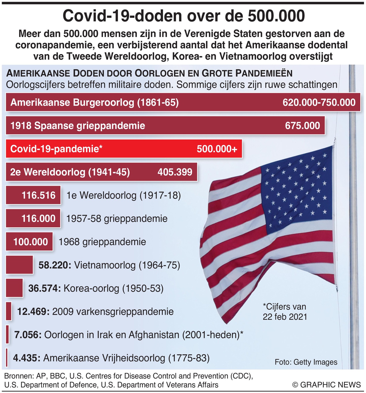In alle landen samen zijn bijna 2,5 miljoen mensen overleden aan de gevolgen van het coronavirus, maar geen enkel ander land werd zo zwaar getroffen als Amerika. De eerste coronadode in de Verenigde Staten viel een jaar geleden. In mei waren er 100.000 slachtoffers, ruim een maand geleden passeerde het dodental 400.000. Inmiddels raakten ruim 28 miljoen Amerikanen besmet met het virus.