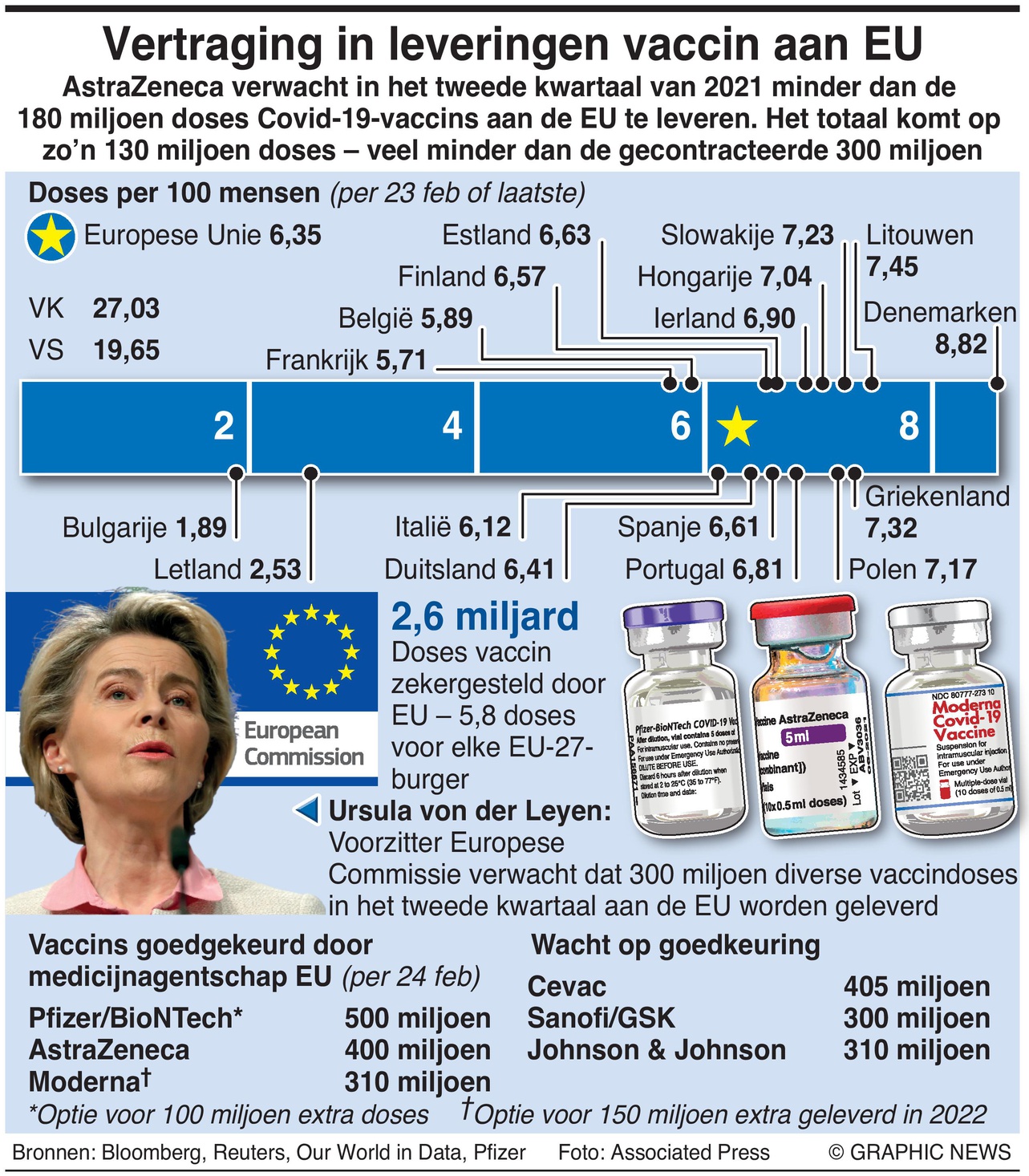 February 25, 2021 – AstraZeneca expects to deliver less than half the 180 million doses of the Covid-19 vaccine to the EU in the second quarter of 2021. The total will be about 130 million doses — well below the 300 million contracted.