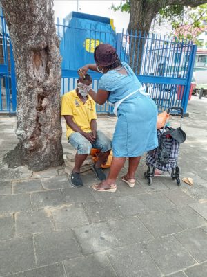 Een burger van het land heeft al een poos de taak op zich genomen om een luisterend oor te zijn voor de personen op straat, die vaak het etiket âdaklozeâ of âzwerverâ opgespeld krijgen. Petrusie Madjerin kamt en knipt de haren van de mannen, die onder de amandelbomen aan de Waterkant de schaduw als enige stabiele factor in hun leven hebben. Met de Surinamerivier op de achtergrond schept dat een rustgevend beeld, maar niets is minder waar. De mannen zijn verhit en geĂŻrriteerd dat zij als bedelaars en zwervers worden behandeld. âAl een jaar wachten we op onze ID-kaartenâ, zegt één van de mannen. Hij zegt op zijn bankrekening SRD 7.000 te hebben, maar er niet bij te kunnen omdat hij zonder een ID-kaart geen bankzaken kan doen. âIk word als een junk behandeld, terwijl ik dit land heb gediend.â
