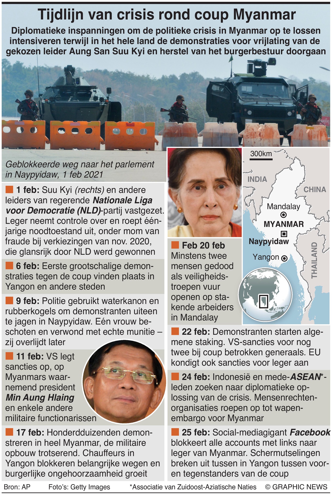 De oppositie eist dat de afgezette regeringsleider Aung San Suu Kyi weer in functie komt. Zij is naar het zich laat aanzien in november met een grote meerderheid herkozen, maar de coupplegers stellen dat die verkiezingen frauduleus verliepen.