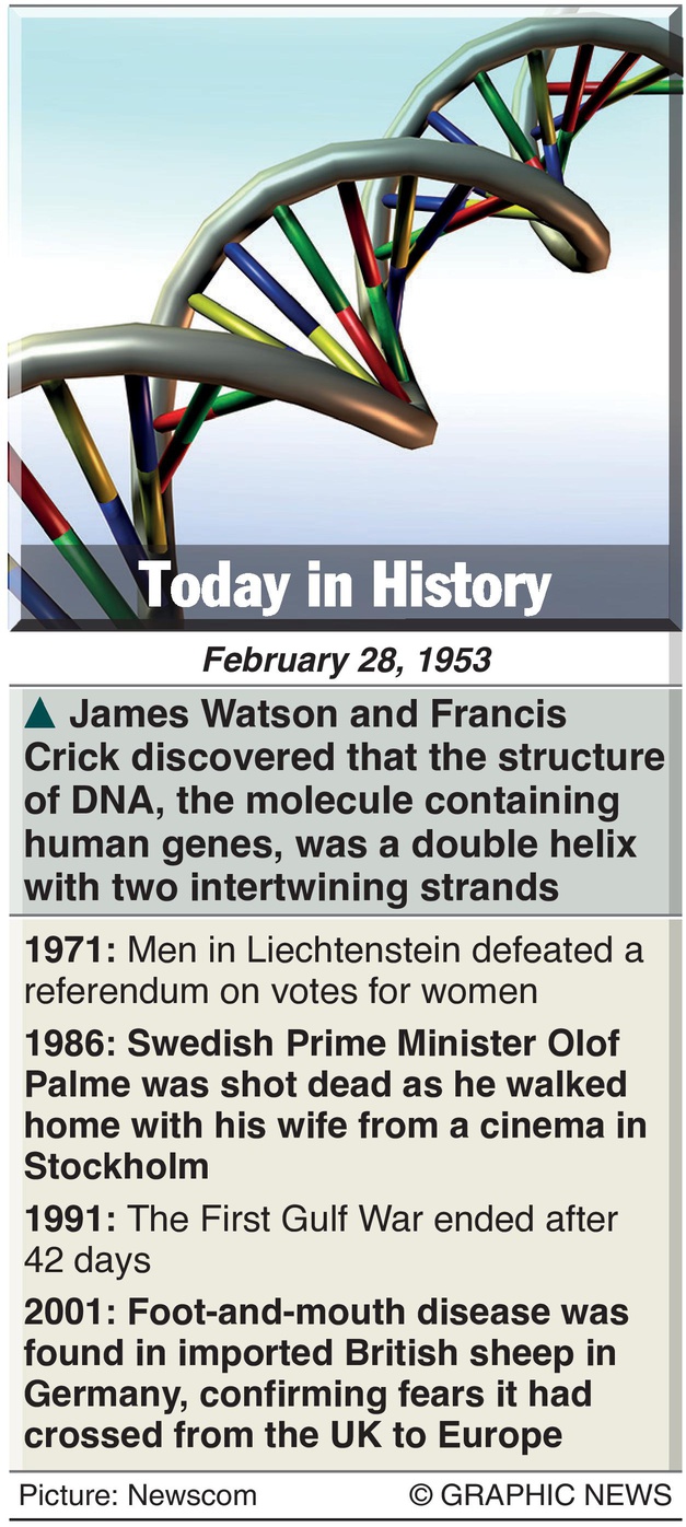 February 28, 1953: James Watson and Francis Crick discovered that the structure of DNA, the molecule containing human genes, was a double helix with two intertwining strands