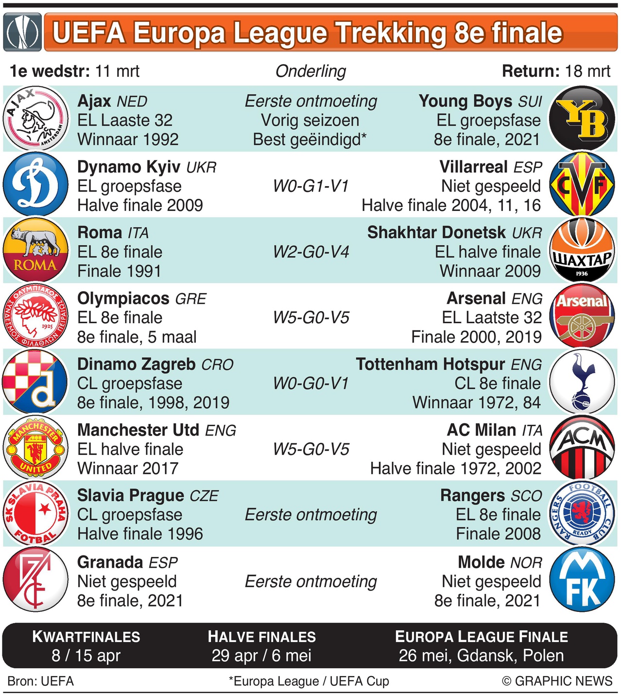 February 26, 2021 – The draw for the Last 16 in the Europa League pits 2017 champions Manchester United against Italian heavyweights AC Milan, and Olympiacos against Arsenal, in a repeat of their Last 32 clash in 2020. Other notable ties of the round include Roma versus Shakhtar Donetsk, Villarreal taking on Dynamo Kyiv, and knock-out stage debutants Granada and Molde facing-off for a berth in the quarter-finals. The matches begin on March 11.