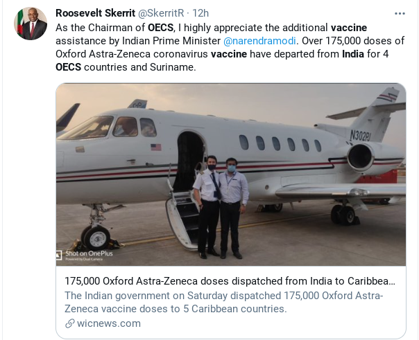 De succesvolle verwerving van vaccins uit India wordt toegeschreven aan de premier van Dominica en voorzitter van de OECS, Roosevelt Skerrit. Zijn goede relatie met India heeft ertoe geleid dat OECS-landen duizenden vaccins gaan ontvangen om de wereldwijde Covid-19 pandemie aan te pakken.