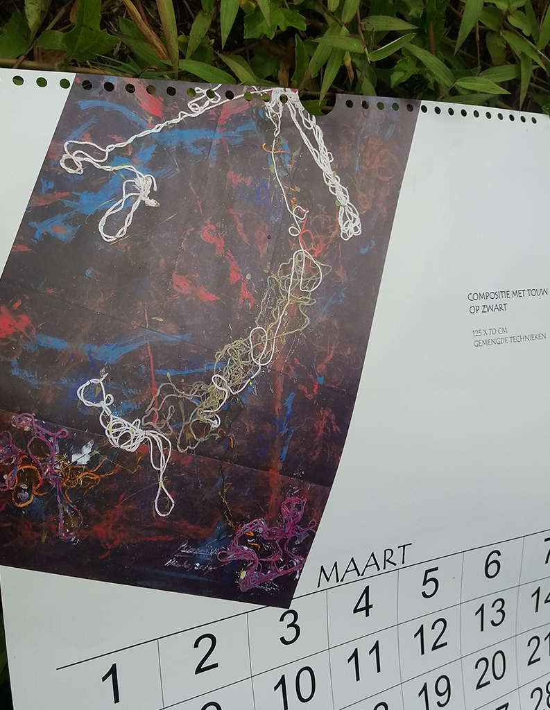 De veelzijdige kunstenaar Waldy Simson heeft zijn kalender voor de maand maart uitgebracht. Dagblad Suriname verkreeg de volgende informatie van de kunstenaar. “Zonder thema vanuit een zwart achtergrond vertrekken en met behulp van andere kleuren en soorten verf, touw, lijm, naald en garen een schilderij maken. Het gemaakte schilderij moet tot meerdere uitleg aanleiding geven en op diverse wijzen geplaatst kunnen worden. Dat was de gedachte waarvan ik uitging.” Het eindresultaat is geworden Compositie met touw op zwart, een schilderij op doek met een afmeting van 120 x 70 cm. De verrassend goede indruk, die gemaakt werd door het schilderij, heeft mij aangezet tot het maken van meerdere, op basis van het eerder genoemd uitgangspunt. De serie schilderijen, composities op zwart, is ontstaan op Aruba en is reeds tentoongesteld in Nederland en België. Online indrukken van de serie kan men krijgen via YouTube kanaal Simson Waldy. Ook in de Kalender Waldy Simson 1 kan men, via het blad van de maand maart waarop er een afbeelding is opgenomen van het schilderij Compositie met touw op zwart, genieten van de vrij recente manier van schilderen van de veelzijdige kunstenaar Simson. De kalender, die zeker nog vier jaren te gebruiken is, staat in het teken van door Simson gemaakte kunst, is direct te gebruiken en is naast een uniek geschenk ook een perfect middel om sociale projecten te helpen ondersteunen. Een concreet project ten behoeve van de Nationale Stichting voor Blinden en Slechtzienden in Suriname zal ondersteund worden uit de opbrengsten van de verkopen.