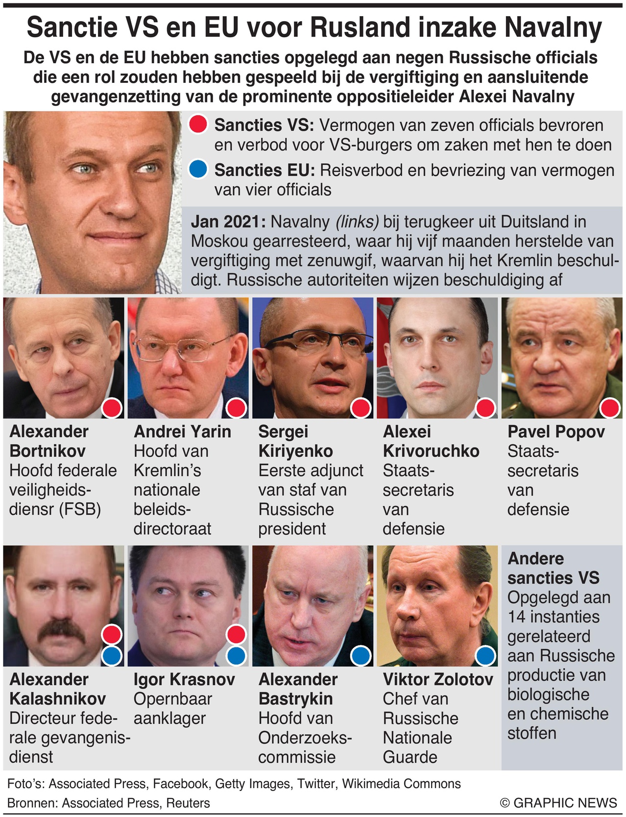 De Verenigde Staten en de Europese Unie hebben Rusland tegelijkertijd strafmaatregelen opgelegd. Washington kwam met sancties voor zeven hooggeplaatste Russen vanwege het vergiftigen van oppositieleider Alexei Navalny; in een Amerikaans inlichtingenrapport staat dat de Russische regering verantwoordelijk is voor de vergiftiging.