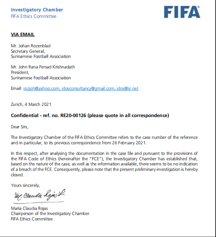 De sportredactie van Dagblad Suriname heeft de hand kunnen leggen op een schrijven van de Onderzoekskamer van de Ethische commissie, welke de SVB aan haar leden heeft doen toekomen. In dit schrijven van 4 maart 2021 wordt het volgende gezegd “…. after analysing the documentation in the case file and pursuant to the provisions of the FIFA Code of Ethics (hereinafter the “FCE”), the Investigatory Chamber has established that, based on the nature of the case, as well as the information available, there seems to be no indication of a breach of the FCE. Consequently, please note that the present preliminary investigation is hereby closed”.