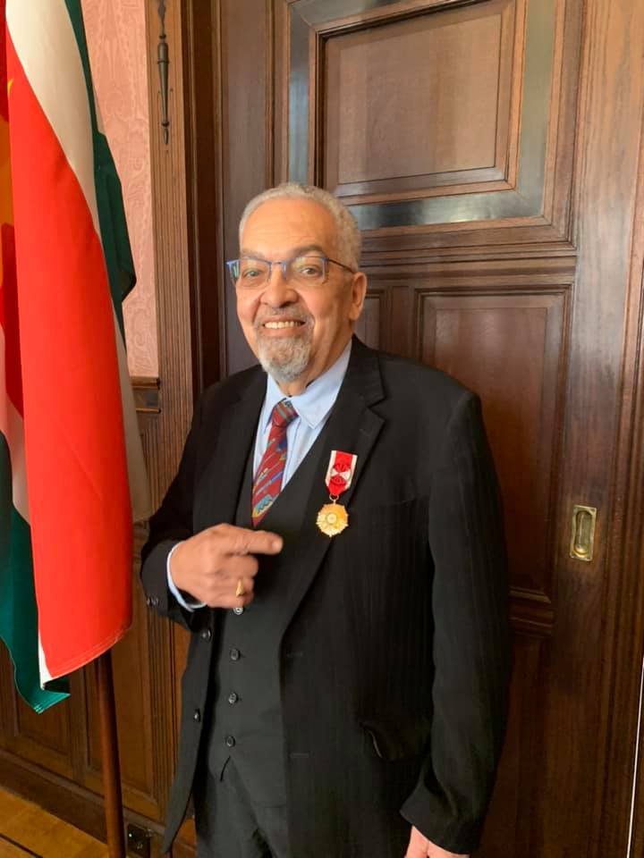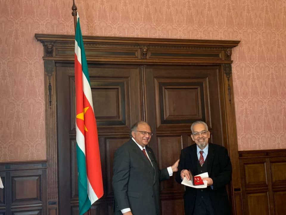 Harold Biervliet kreeg vrijdag de versierselen die behoren tot Officier In de Ere Orde Van de Gele Ster door de ambassadeur van Suriname, Radjendre Khargi in Den Haag opgespeld, namens president Chandrikapersad Santokhi.