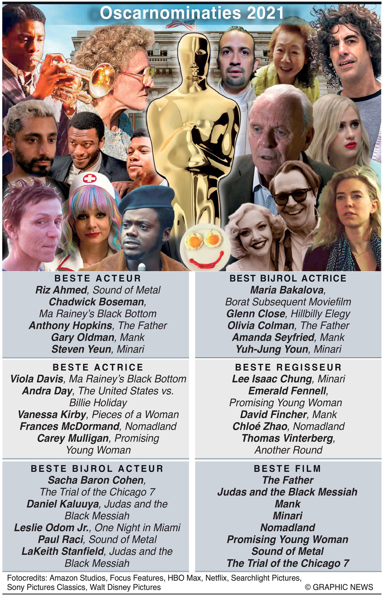 March 15, 2021 – April 25, 2021 – Sacha Baron-Cohen, Carey Mulligan, Olivia Colman, Daniel Kaluuya and Sir Anthony Hopkins are among the stars nominated for this year’s Oscars. The nominees also include Vanessa Kirby, Gary Oldman and Riz Ahmed. They are joined by the likes of Frances McDormand, Glenn Close, Viola Davis and the late Chadwick Boseman.