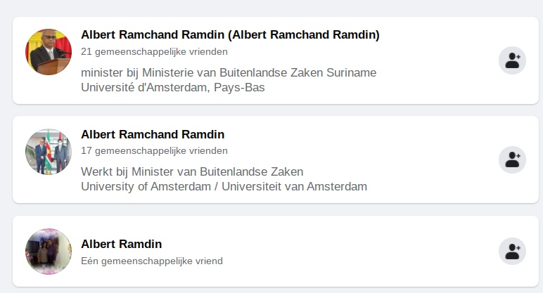 De ministers Albert Ramdin van Buitenlandse Zaken, International Business en Internationale Samenwerking, en Armand Achaibersing van Financiën en Planning blijken nog steeds een aantal nep-Facebook accounts op hun naam te hebben, zo bleek de redactie van Dagblad Suriname na een rondgang op Facebook.