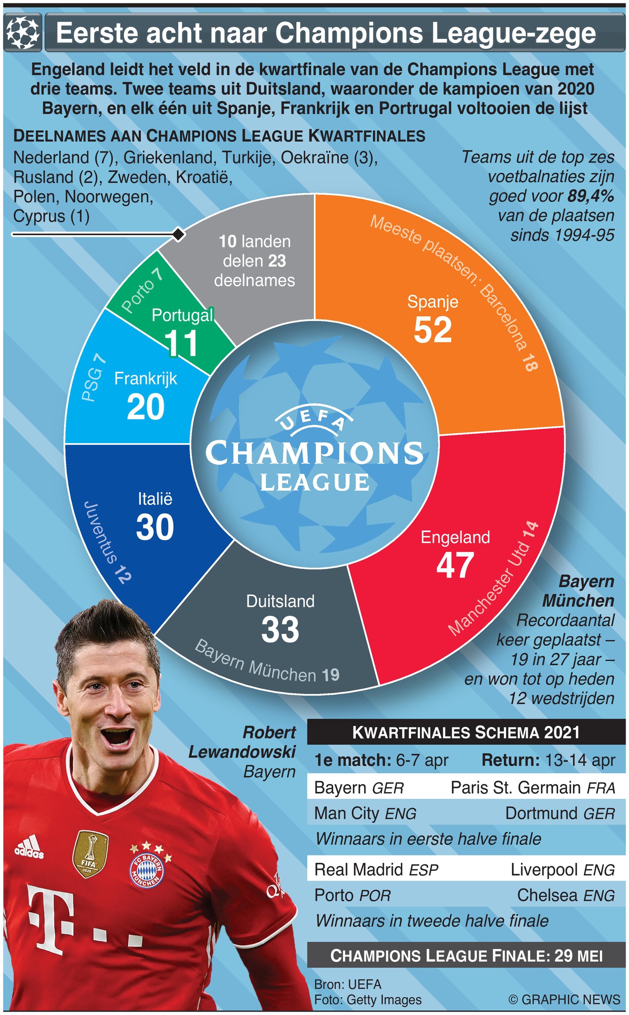 April 6, 2021 – April 14, 2021 – The quarter-finals in the UEFA Champions League takes place across Europe, as the knockout stages continue. England lead the Champions League quarter-final field with three teams, while two teams from Germany, including 2020 champions Bayern, and one each from Spain, France and Portugal complete the line-up.