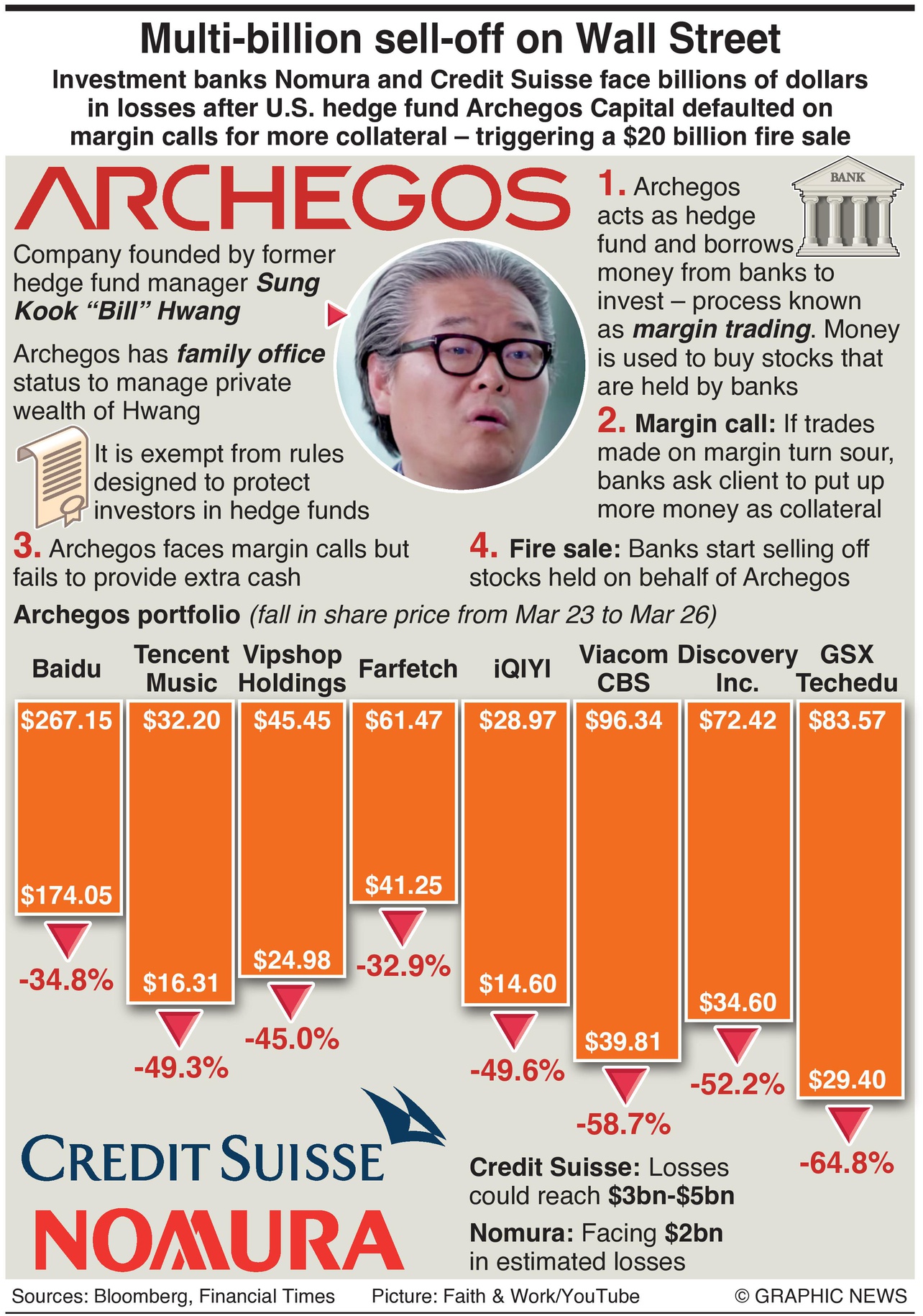 March 30, 2021 – Investment banks Nomura and Credit Suisse face billions of dollars in losses after U.S. hedge fund Archegos Capital defaulted on margin calls for more collateral — triggering a $20 billion fire sale.