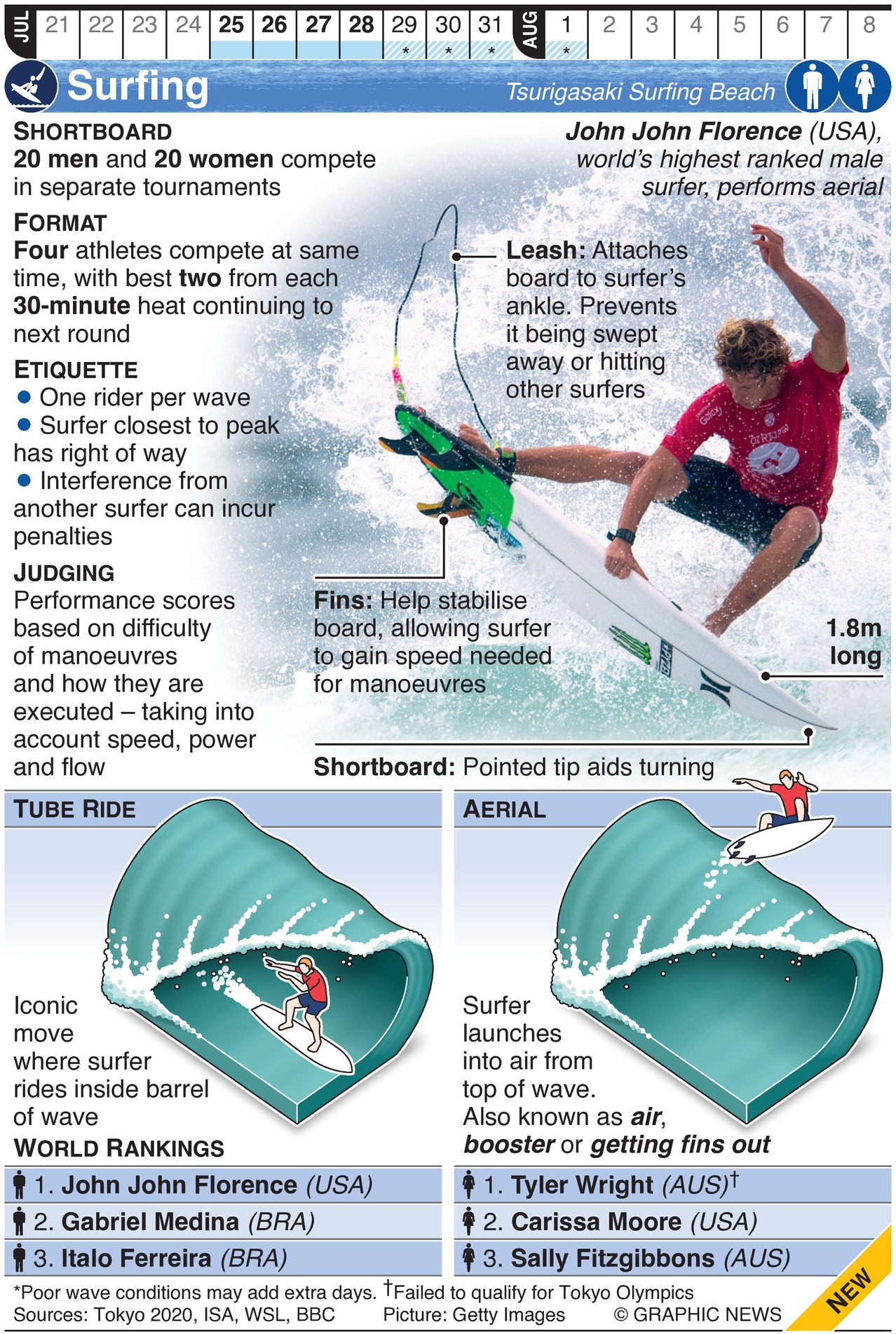 The world’s top surfers will compete on Japan’s spectacular Pacific coastline. Men and women will take part in in Shortboard tournaments, striving to perform the most impressive aerials and tube rides.