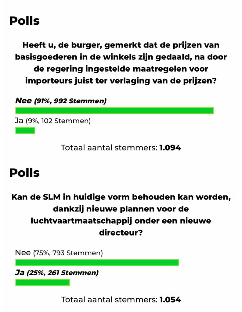 Uit een tweede poll, die de afgelopen dagen was geplaatst op de website van Dagblad Suriname, blijkt dat veel burgers geen geloof meer hebben in een toekomst voor de SLM. Op de vraag of de luchtvaartmaatschappij voor de toekomst behouden kan worden onder een nieuwe leiding en zijn plannen, heeft 75 procent (793 stemmen) geantwoord daar geen vertrouwen in te hebben. 261 personen (25 procent) hebben echter nog wel geloof in een toekomst voor de SLM, ondanks de penibele financiële situatie en de kleine vloot.