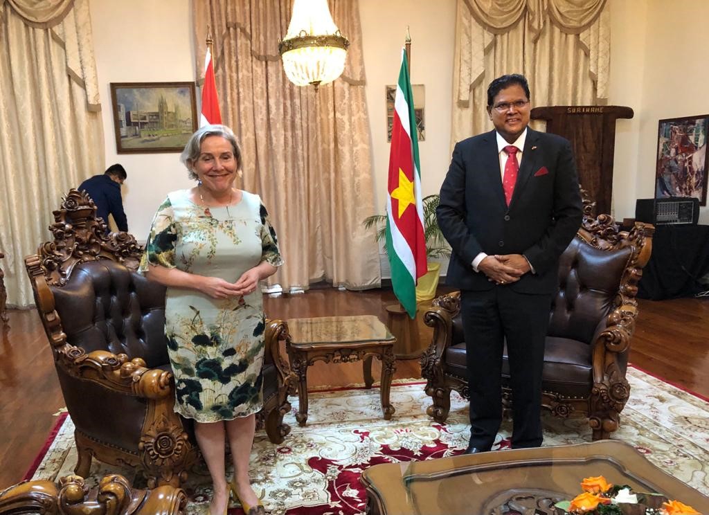 De Nederlandse minister van Defensie, Anna Bijleveld-Schouten, heeft vrijdag 9 april een beleefdheidsbezoek gebracht aan president Chandrikapersad Santokhi in het presidentieel paleis. De minister zei het een eer te vinden, dat zij een bezoek heeft kunnen brengen aan de Suriname. Zij benadrukte, dat Suriname een belangrijke partner is, zo schrijft de Communicatie Dienst Suriname.